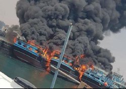 پس از آتشسوزی در بندر رجایی در استان هرمزگان در جنوب کشور، امروز جمعه شش شناور باری از جمله پنج شناور پهلو گرفته در بندر«نخل تقی» و یک شناور لنگرانداخته در بندر «بوالخیر» استان بوشهر در آتشسوزی سوختند. (فیلم زیر)